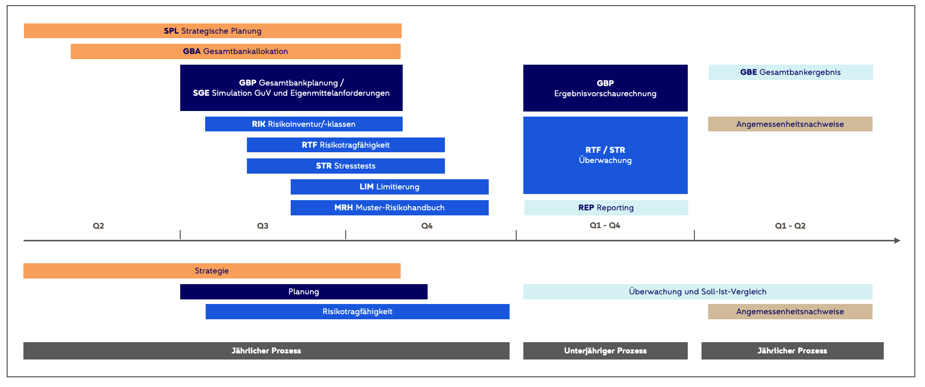 Zentrale Bestandteile sind die aufeinander aufbauenden Verfahren zur Strategie, Planung, Risikotragfähigkeit und zum Reporting.