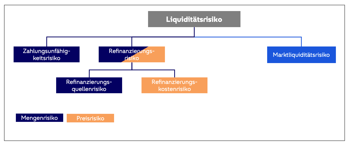 Die Messung und Steuerung des Liquiditätsrisikos wird in zwei Risikokomponenten unterschieden: die mengenorientierte Liquiditätsrisikosteuerung (Zahlungsunfähigkeitsrisiko) und die preisorientierte Liquiditätsrisikosteuerung (Refinanzierungskostenrisiko). In der mengenorientierten Sicht wird die Liquiditätstragfähigkeit ermittelt, um so den Überlebenshorizont des Instituts zu ermitteln. In der preisorientierten Sicht werden die Veränderungen von sich über die Zeit ändernden Liquiditäts-Spreads und die daraus resultierenden Auswirkungen auf den Liquiditätsstrukturbeitrag sowie das Zinsergebnis bewertet.