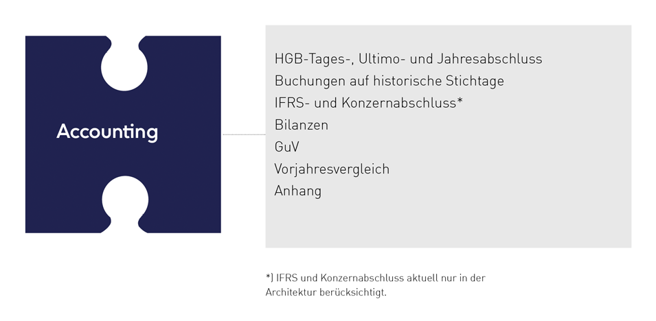 Der Funktionsumfang fußt auf der Datenbasis, bietet zentrale Buchungen auf historischen Stichtagen und erstellt Bilanz-, Gewinn- und Verlustrechnungen und Anhang bis hin zum Berichtswesen. Dieses Funktionsspektrum wird in Kürze ergänzt durch eine Jahresabschlussanwendung sowie ein Modul zur Anlagenbuchhaltung.