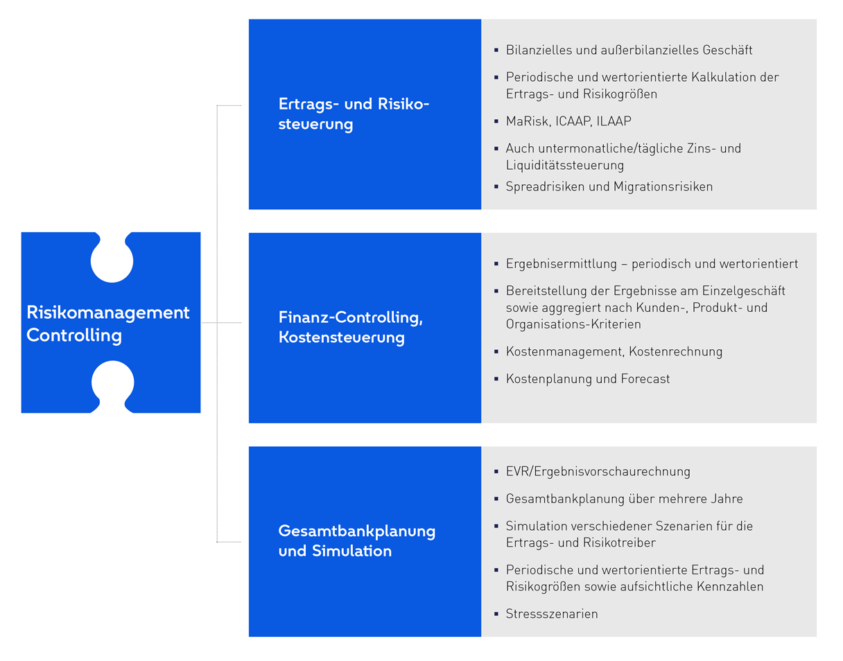 Die Komponente Controlling & Risikomanagement umfasst die modulare Standardsoftware der parcIT und die dort entwickelten Methoden und Verfahren. Sie beinhaltet eine hochintegrierte Softwaresuite für die Bereiche Gesamtbanksteuerung, Kundengeschäftssteuerung, Adressrisikosteuerung, Marktrisikosteuerung, Liquiditätsrisikosteuerung sowie die Steuerung operationeller Risiken und stellt Daten und Ergebnisse für Accounting- und Meldewesenthemen in anderen EGP-Komponenten bereit.