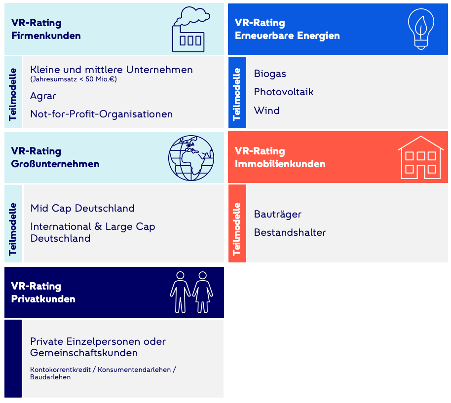 Im Zielbild werden alle VR-Ratingverfahren modular aufgebaut sein. Bereits mit einem modularen Aufbau verfügbar sind die Verfahren für Firmenkunden (einschließlich Großunternehmen) und Immobilienkunden. Für Privatkunden und Projektkunden (einschließlich Erneuerbare Energien) ist ein modularer Aufbau in der Entwicklung.
