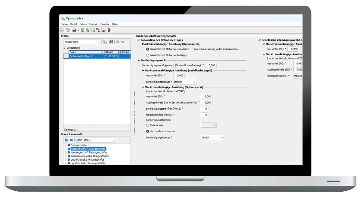 Mit diesem Bestandteil können Sie marktzinsabhängige und marktzinsunabhängige Sondertilgungs- und Kündigungsoptionen in der Vorkalkulation von Geschäften berücksichtigen. Das Ergebnis dieser Bewertung fließt in der Deckungsbeitragsbetrachtung in Konditionsbeitrag und Optionsbeitrag ein.