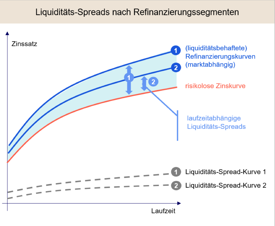 Durch einen unerwarteten Abzug von Liquidität und gleichzeitig steigenden Liquiditäts-Spreads entsteht das Risiko, in Zukunft höhere Refinanzierungskosten tragen zu müssen. Dabei beinhaltet die Methodik die Beschreibung eines normativen Szenarios zur Ableitung eines pauschalen Risikobetrags für die ökonomische Risikotragfähigkeitsrechnung.