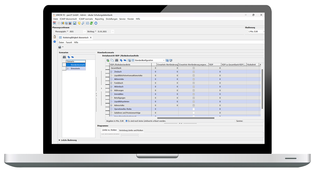 okular SIMON verdichtet die Steuerungskennzahlen aus den Vormodulen und unterstützt Sie bei der Erstellung der ökonomischen Risikotragfähigkeit inklusive der Risikolimitierung sowie der Abbildung von übergreifenden Stresstests für die Gesamtbank. Zusätzlich ist die normative Risikotragfähigkeit in okular SIMON integriert, so dass die Steuerung der Anforderungen aus dem ICAAP vollumfänglich in SIMON erfolgen kann.