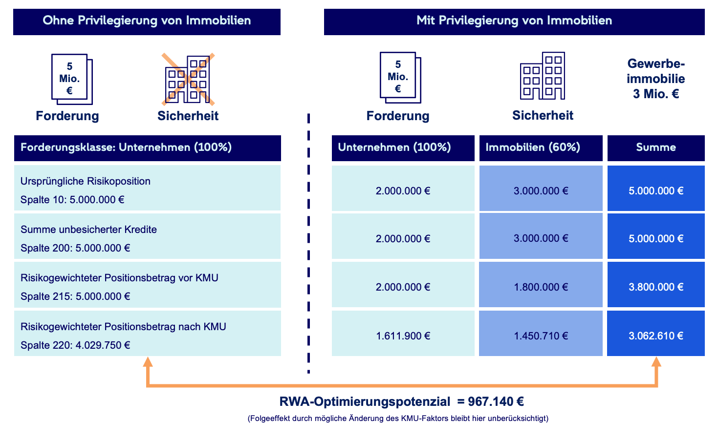 - Detaillierte Übersicht der RWA-Optimierungspotenziale (Privilegierung von Wohn-, Gewerbe- und nicht anrechenbaren Immobilien sowie Anrechnung von Bausparverträgen, Lebensversicherungen, Bareinlagen und Bürgschaften)