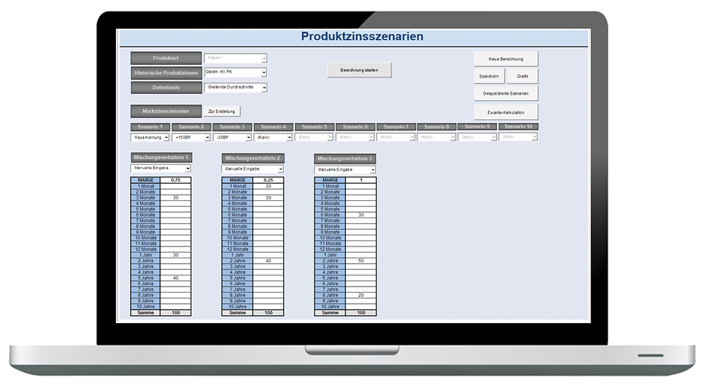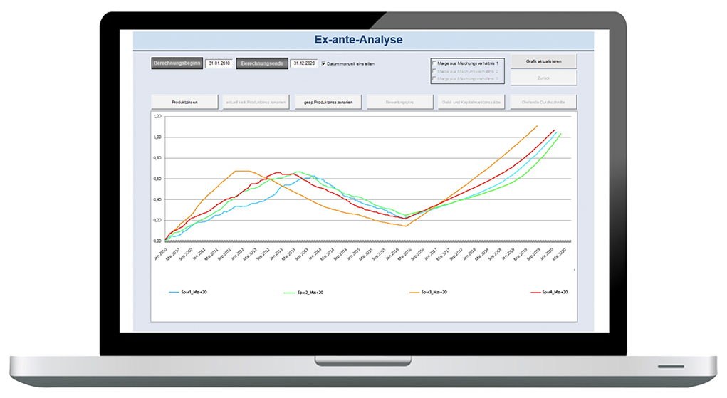Das neue Modul „Produktzinsszenarien“ bietet Ihnen die Möglichkeit, durch Kombination von Marktzinsszenarien und Mischungsverhältnissen bis zu 30 verschiedene zukünftige Entwicklungen in einem Schritt zu kalkulieren.