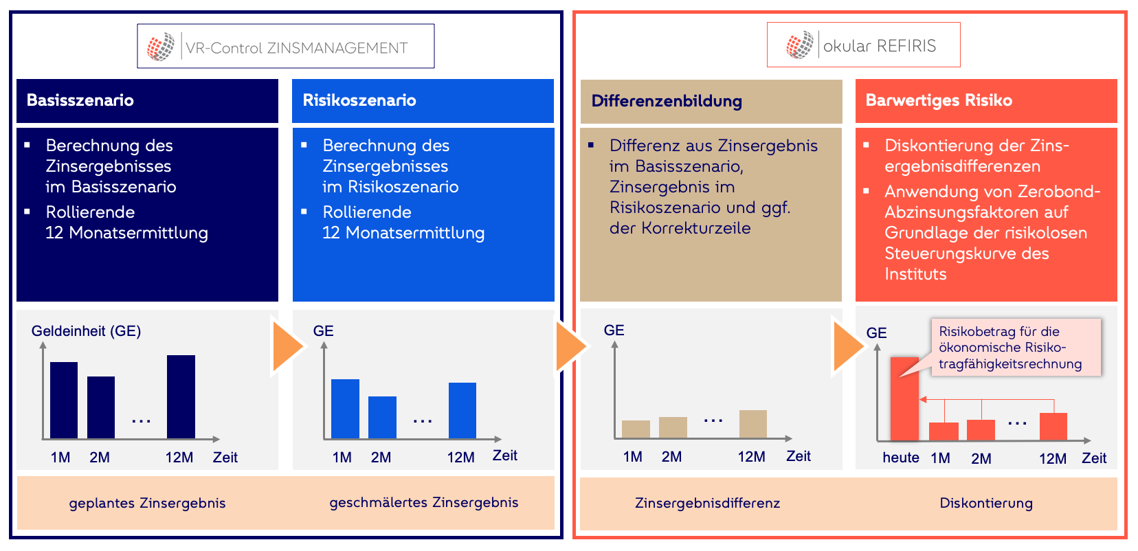 Das okular-Tool REFIRIS verfolgt das Ziel, die Berechnung des Refinanzierungskostenrisikos zu unterstützen. Dazu baut okular REFIRIS auf den in VR-Control ZINSMANAGEMENT ermittelten Ergebnissen von Zinsergebnisbilanz-Simulationen in einem Basis- und Risikoszenario auf. In der Abbildung ist dargestellt, dass die letzten notwendigen Rechenschritte mit okular REFIRIS durchgeführt werden können und so den revisionssicheren Abschluss der Berechnung des Refinanzierungskostenrisikos sicherstellen.