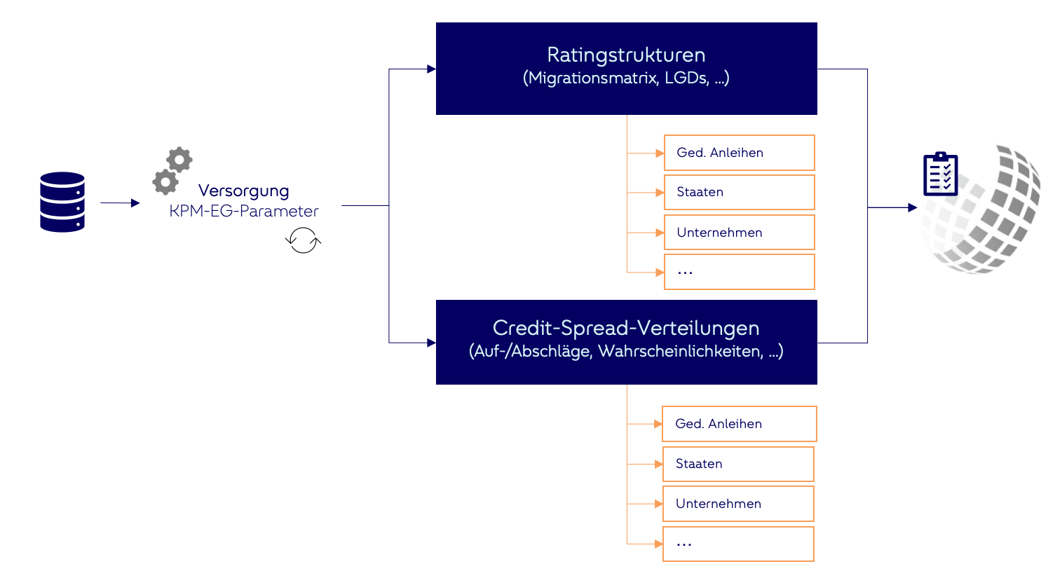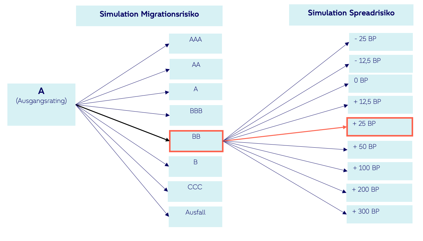 Während der Monte-Carlo-Simulation schwankt ein Geschäft in seinem Wert durch simulierte Ratingveränderungen und/oder durch Credit-Spread-Änderungen. Die Migrationswahrscheinlichkeit in eine Ratingklasse ist in der entsprechenden Migrationsmatrix definiert. Aus der Credit-Spread-Verteilung wiederum wird ein Aufschlag bzw. Abschlag in BP gezogen. Die BP-Änderung wird pauschal auf die Diskontkurve aufgeschlagen. Wie stark die beiden Risikobetrachtungen miteinander korrelieren, ist individuell parametrisierbar.