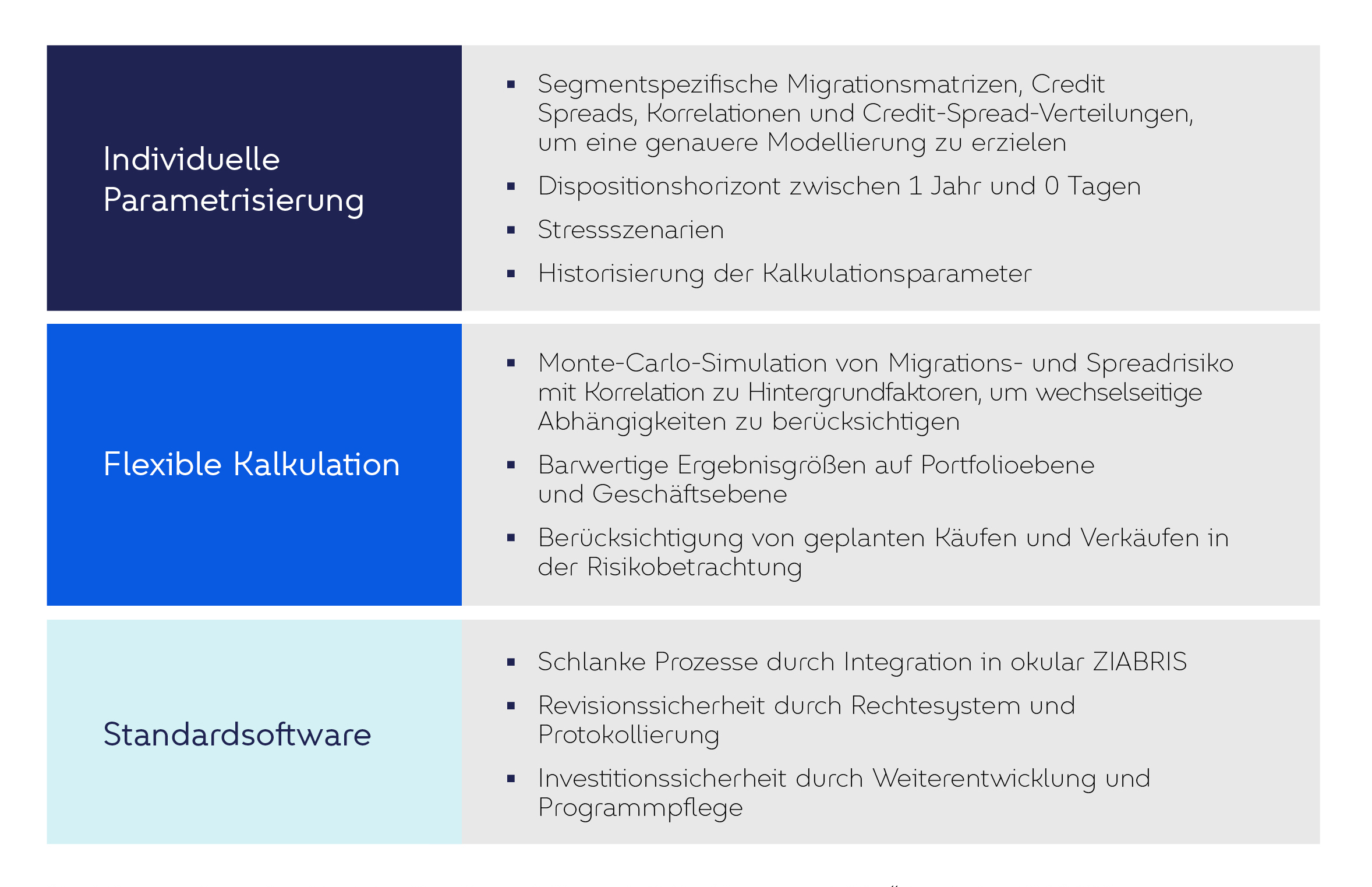 Bewährte Funktionen aus okular ZIABRIS stehen Ihnen auch im Modul „Kreditportfoliomodell für Eigengeschäfte“ zur Verfügung und führen in Verbindung mit der integrierten Datenhaltung zu effizienten Bewertungs- und Steuerungsprozessen, denen eine einheitliche methodische Basis zugrunde liegt.
