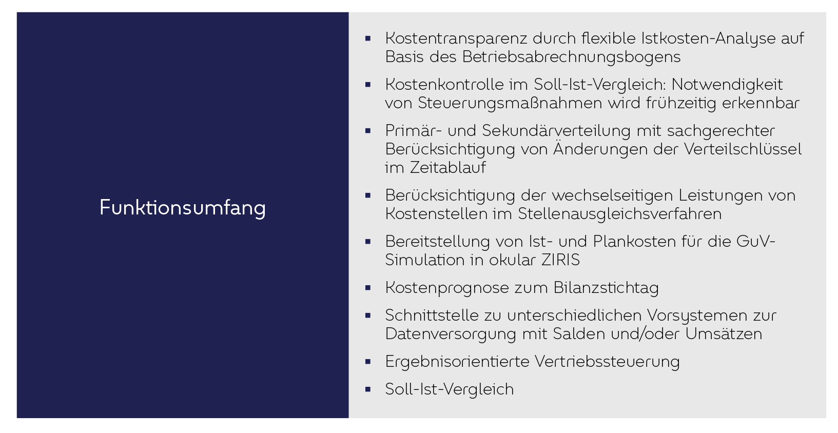 - Verursachungsgerechte Kostenverteilung über Primär- und Sekundärverteilung mit dynamischer Anpassung an Veränderungen im Zeitverlauf; inklusive Unterstützung von Stufen- und Stellenausgleichsverfahren