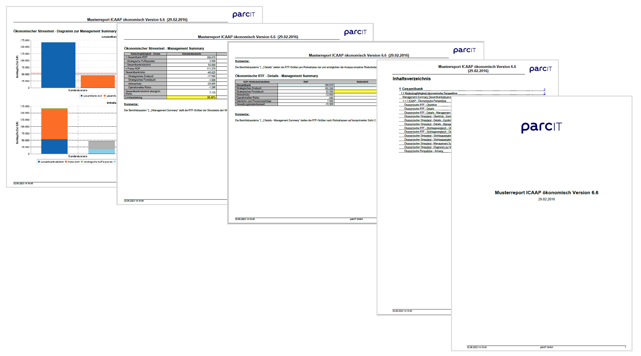 Für die ökonomische Risikotragfähigkeit stehen Ihnen im MaRisk-Risikoreporting vielfältige Berichtsbausteine zur Verfügung. Die Detailtiefe sowie die dargestellten Berichtsgrößen dieser Auswertungen können Sie hierbei für die Stichtagsbetrachtung sowie den Stichtagsvergleich individuell bestimmen. Für die genannten Berichtsbausteine stehen Ihnen jeweils zwei Alternativen zur Verfügung, sodass Sie beispielsweise die Auswertungen für die unterschiedlichen Berichtsempfänger konfigurieren können.