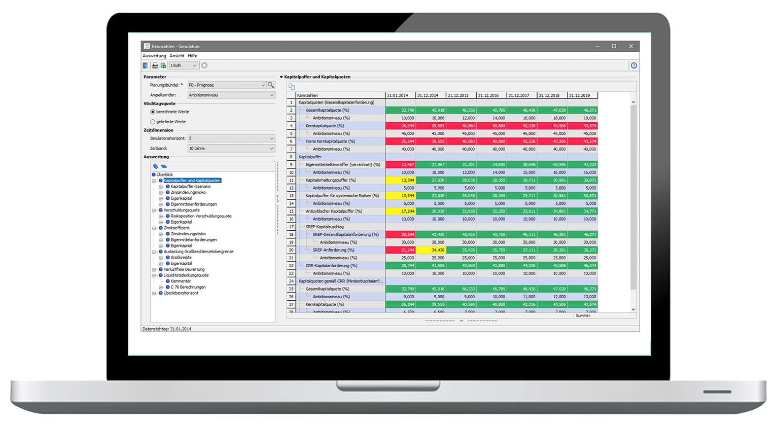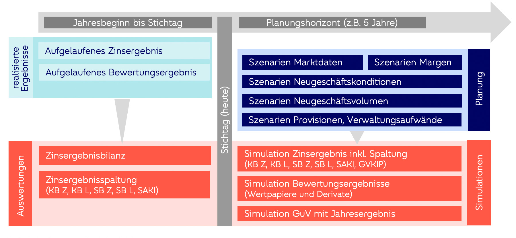 Die darauf aufbauende Simulation von Kapitalquoten, Kapitalpuffern, Verschuldungsquoten und EVE-Barwertsensitivitäten liefert Ergebniskennzahlen auf Basis einer integrierten und konsistenten Planung und bildet die Grundlage für die normative Perspektive des ICAAP, in der das normative Risikodeckungspotenzial den normativen Risiken gegenübergestellt wird.