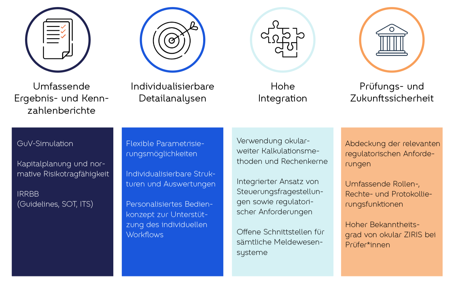 okular ZIRIS unterstützt als ALM-Lösung die Steuerung und Risikomessung des Zinsbuches gleichermaßen unter barwertigen sowie periodischen Gesichtspunkten. Neben der Zinsänderungsrisikosteuerung setzen auch die Funktionen zur Marktrisikosteuerung sowie der Liquiditätssteuerung einen Schwerpunkt.