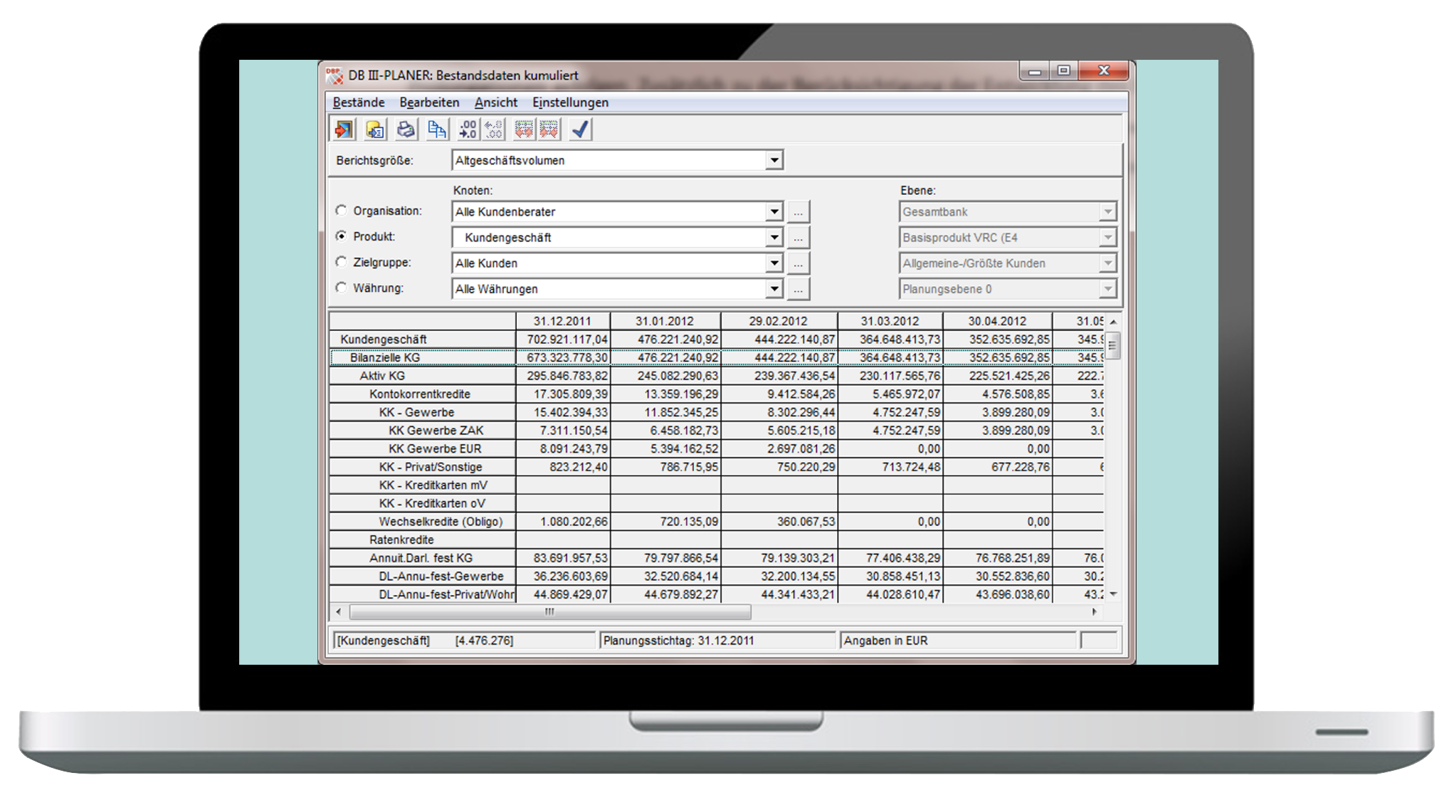 okular DB III-PLANER liefert betriebswirtschaftlich zutreffende und eindeutige Aussagen über die Ertrags- und Geschäftsentwicklung des Vertriebs und ermöglicht so eine ergebnisorientierte Planung des Kundengeschäfts auf einer einheitlichen Datenbasis.