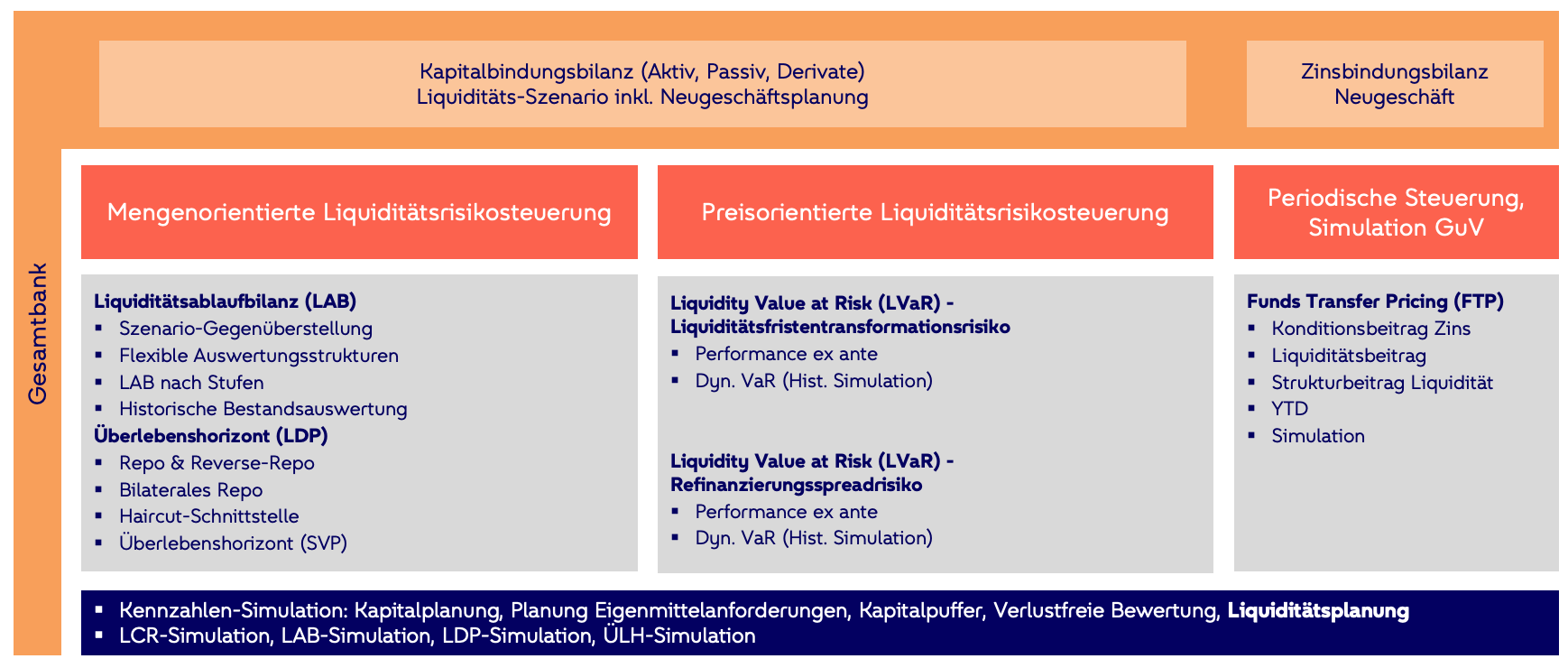 Im Rahmen der Liquiditätsrisikosteuerung werden die Cashflows nach Kapitalbindungs-Gesichtspunkten kalkuliert und können szenariobasiert modelliert werden. Dabei kann auch die GuV-Planung in die Betrachtung mit einbezogen werden. Dies ermöglicht sowohl eine mengen- als auch preisorientierte Liquiditätsrisikosteuerung zur Berücksichtigung von Zahlungsunfähigkeits- und Refinanzierungskostenrisiken.