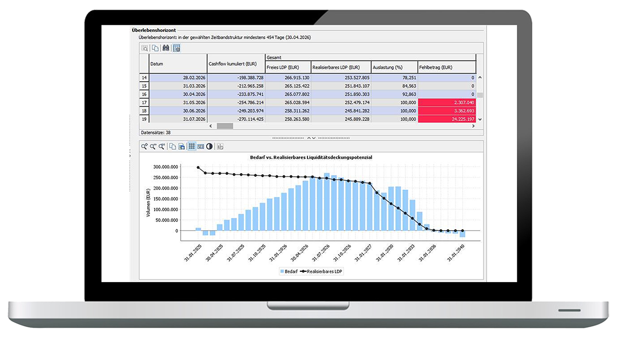 - Liquiditätsplanung mit Simulation der LCR und des Überlebenshorizonts