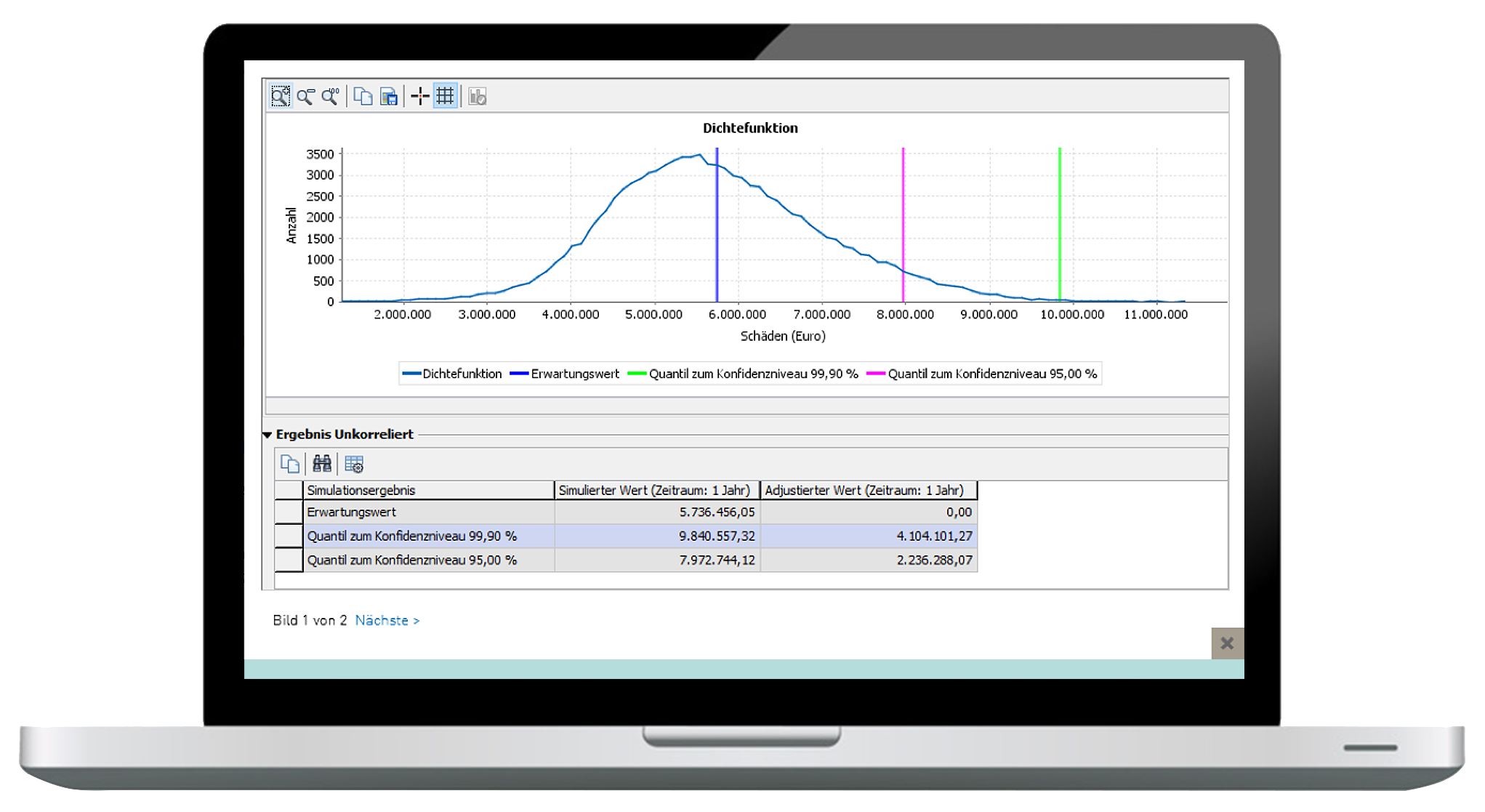 Mit Hilfe der Monte-Carlo-Simulation ermitteln Sie anhand der individuell am einzelnen Risiko hinterlegten Eintrittshäufigkeiten und Schadenswerte einen Value at Risk sowie den erwarteten Verlust für die interne Steuerung, die die Grundlage für die ökonomische Risikotragfähigkeit darstellen.