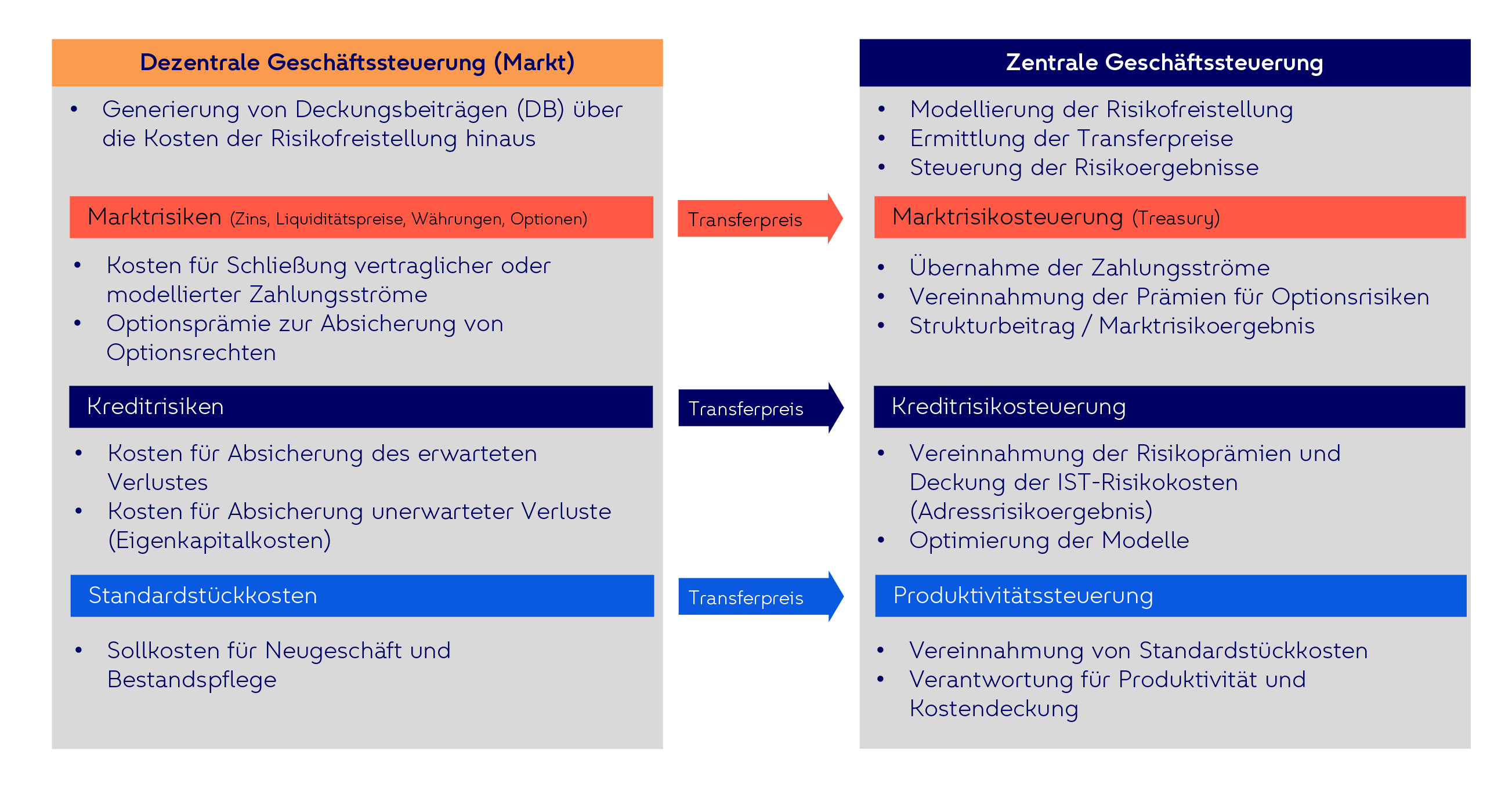 Die Deckungsbeitragsrechnung ermöglicht eine effektive Vertriebs- und Ergebnissteuerung des Kundengeschäfts sowohl barwertig als auch periodisch. In einem mehrstufigen Schema werden alle relevanten Ertrags-, Risiko- und Kostenkomponenten integriert: von Refinanzierungskosten und Prämien für das Options- und Kreditrisiko über Standardstückkosten, Beiträge zu den Sicherungseinrichtungen bis hin zu den ökonomischen und regulatorischen Kapitalkosten.