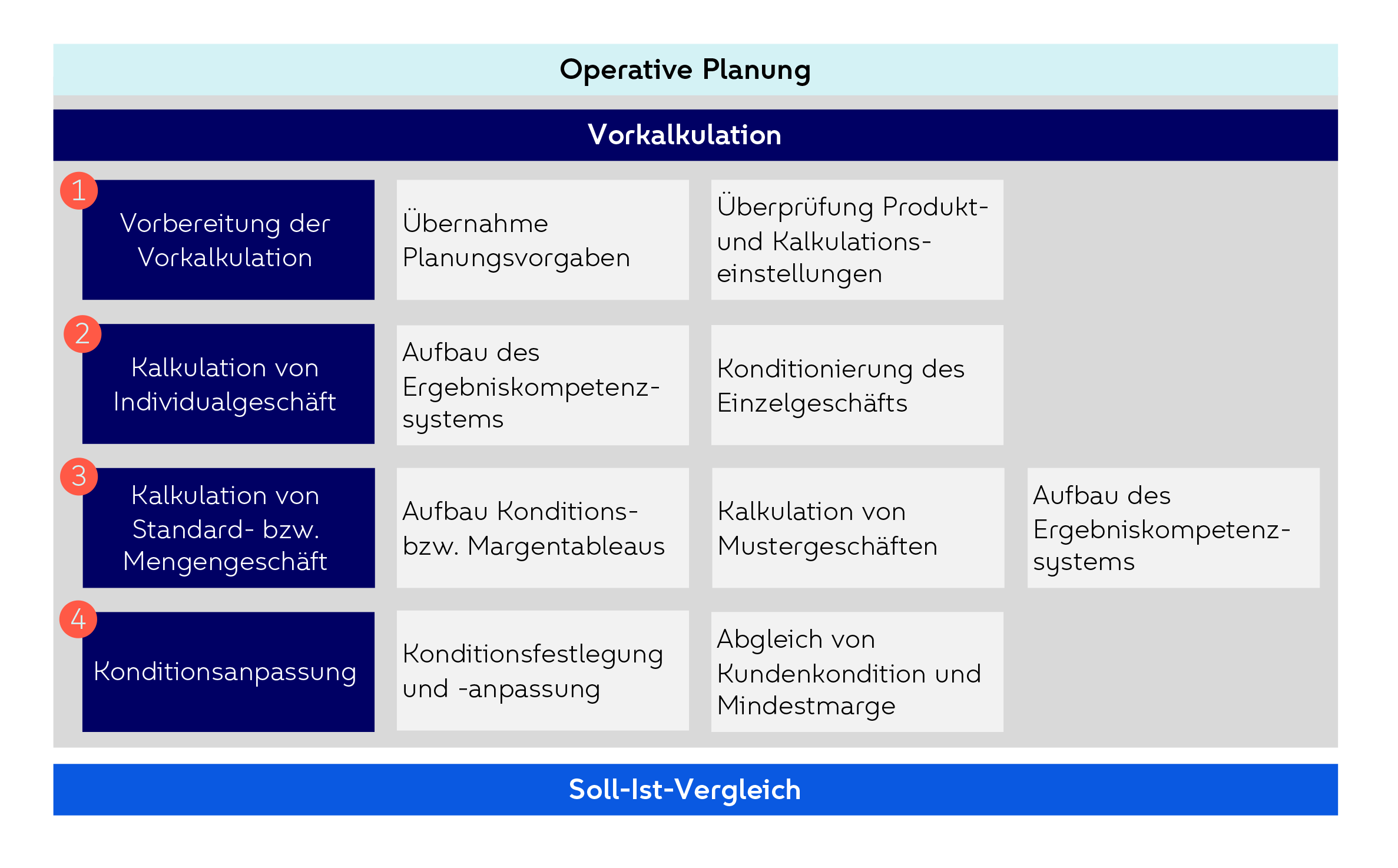 Die Vorkalkulation schließt sich an die Planungsverfahren von VR-Control an. Während die methodischen Grundlagen im Fachkonzept zur Deckungsbeitragsrechnung erläutert werden, beschreibt der Leitfaden zur Vorkalkulation den Bankprozess von der Parametrisierung über die Kalkulation von Mustergeschäften bis hin zur Erstellung von Margentableaus sowie Anpassung von Konditionen. Eine Prozesslandkarte inkl. idealtypischer Aufbauorganisation unterstützt die Bank bei einer Pricing Governance gemäß bankaufsichtlicher Anforderungen.