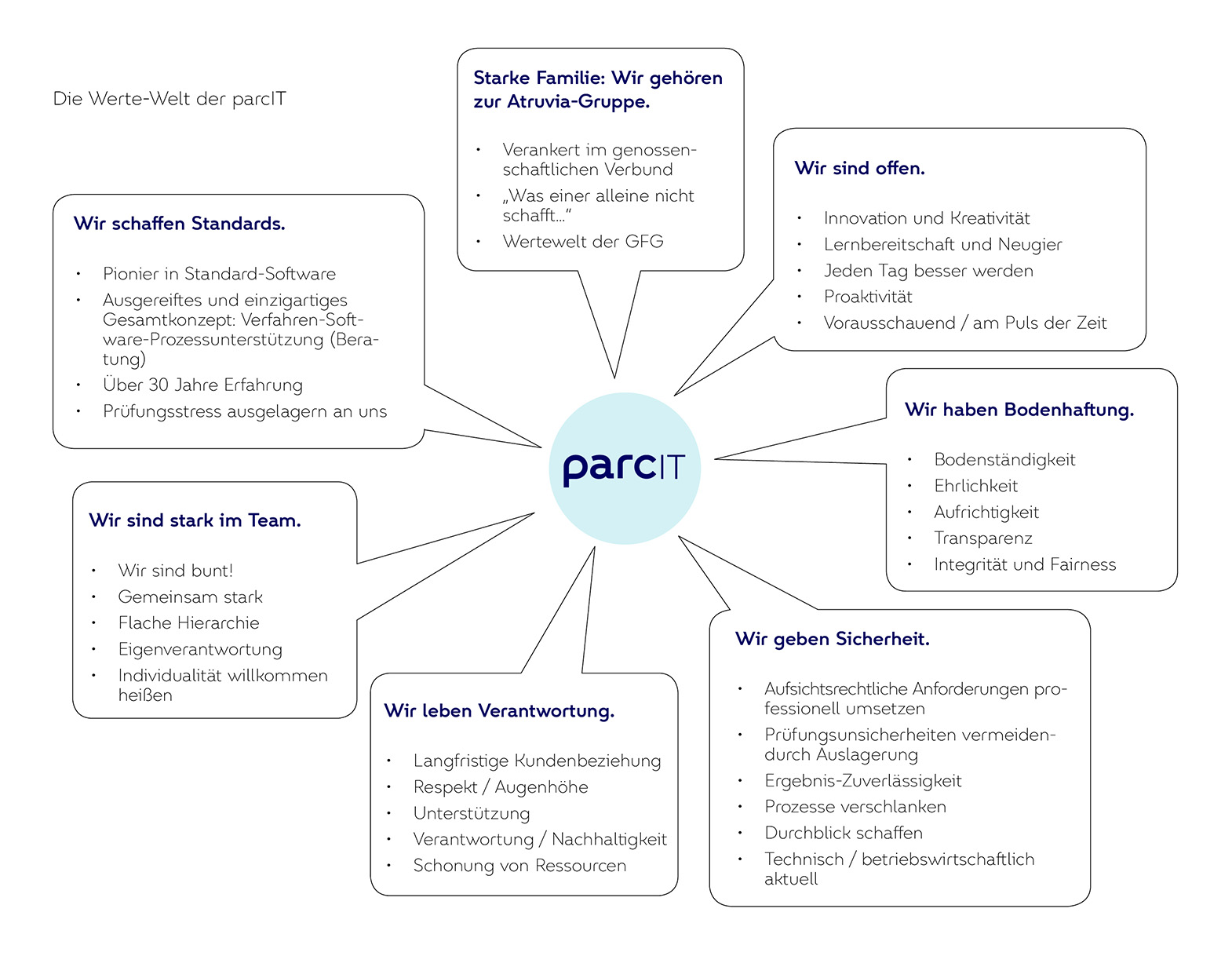 Unsere Wertewelt hat zwei Grundpfeiler: Der eine heißt „Genossenschaft“ und bringt ein komplexes soziales und gemeinschaftsorientiertes Credo mit sich, das heute aktueller ist denn je. Der andere heißt „Team parcIT“, denn es sind die Menschen dieser Unternehmung in ihrer Buntheit, ihrem Zusammenhalt und ihrem täglichen, gemeinsamen Schaffen, die die Werte im Geist von Gründer Klaus Wiegand aufrechterhalten.